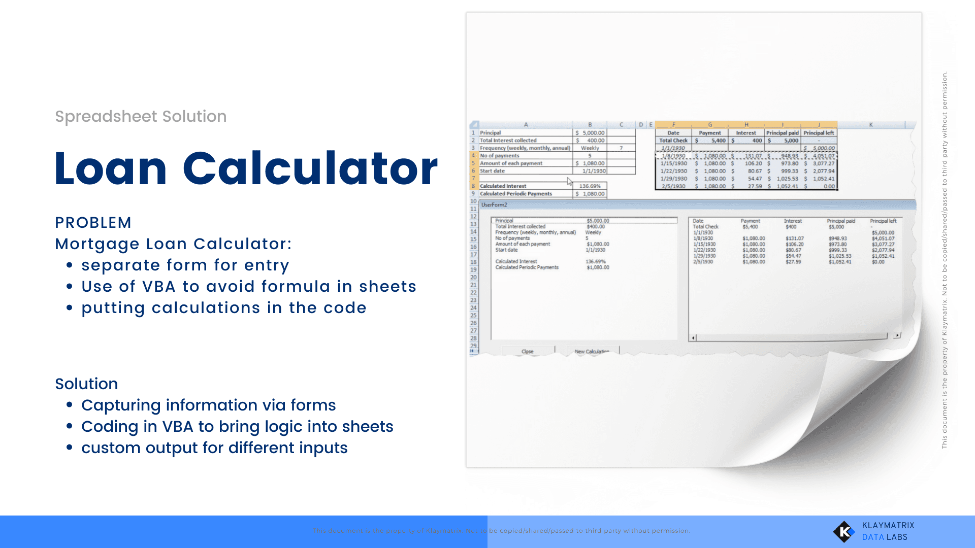 Created a user-friendly input form using VBA for capturing loan details